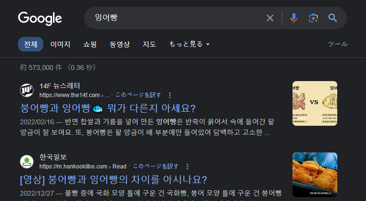 검색창에서 한글로 검색해도, 한국에서 검색하던 결과도 나옵니다 , 붕어빵을 검색해볼까요?